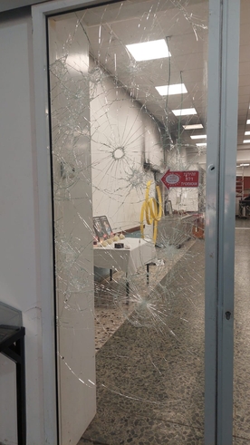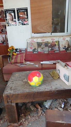 דלת הכניסה מחוררת מקליעים ולצד הקיר עשרות תמונות של הנרצחים והחטופים, ביניהם בני משפחת ביבס.