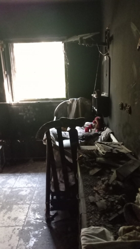 בתמונה העליונה: חדר שרוף ובתוכו מיטת תינוק